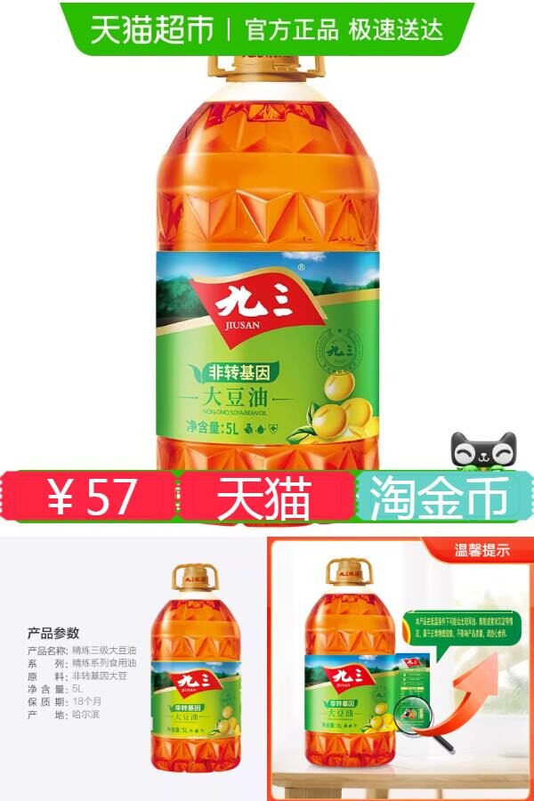 【官方立减37.9+5元店铺优惠+淘金币5.99+88VIP,到手低至约49元/桶】九三非转基因大豆油5L,大桶装,价格美丽,速度抢购~