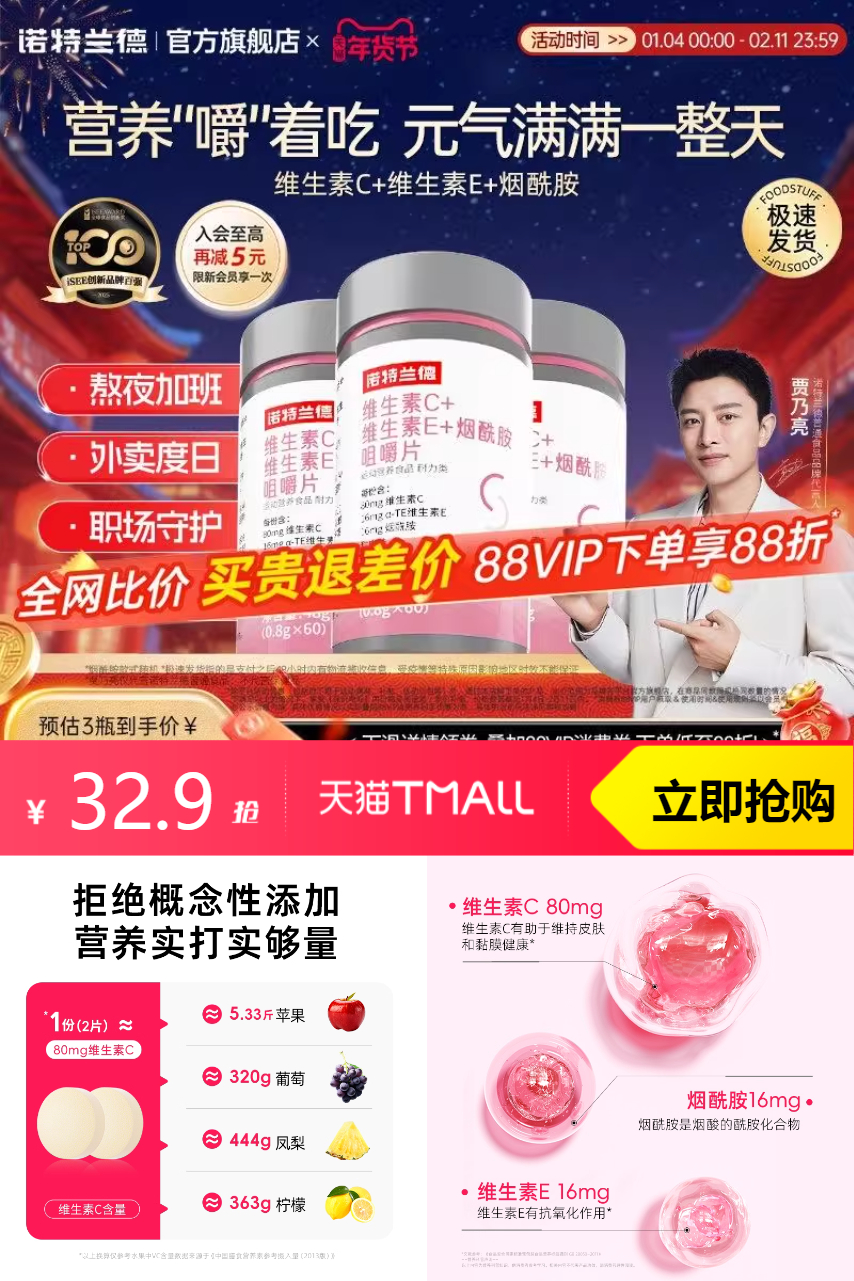 【官方立减8元,店铺会员优惠2元,88VIP优惠1.65元,淘金币抵扣6.34元。】诺特兰德烟酰胺维生素c维生素e咀嚼片,肌肤养护好搭档,三效合一,美容佳品!日常保健新选择,天然维生素C&E。
