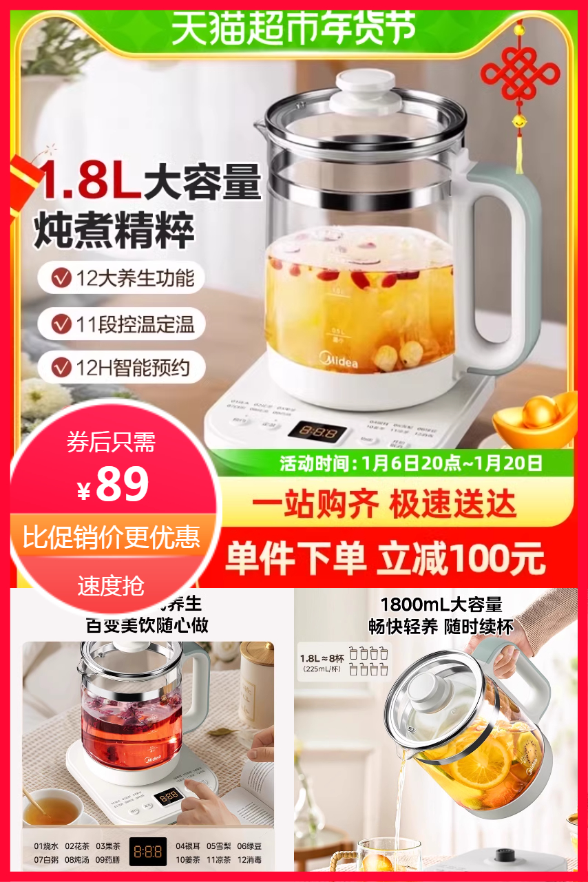美的养生壶多功能炖煮一体烧水壶1.8L,煮茶 + 炖煮 + 烧水!一机多用!操作简便!适合家用和办公室!关键功能齐全!