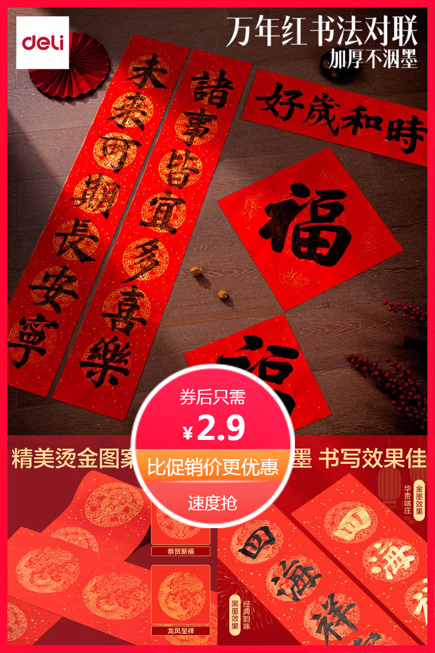 叠金币到手2.73元,2026新款马年,得力对联专用纸,纸张厚实,书写流畅,精美烫金图案,不易褪色,遇水不易破,可长期保存,尺寸齐全,趁活动赶紧囤起来