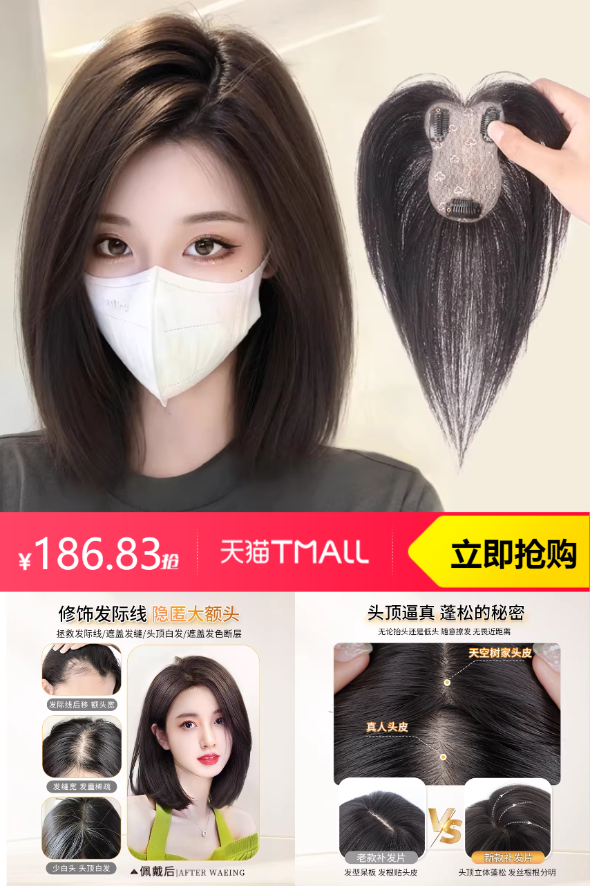 ⭕假发女片头顶全真发遮白发补发蓬松增发量
