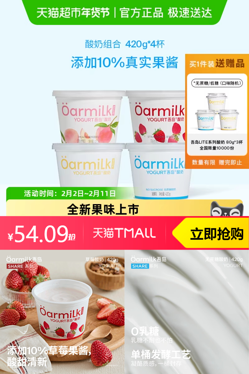 【420g*4大桶多种口味组合任选,买就送80g*3杯,一共到手7杯,叠加88立减2.95+淘金币1.96到手54.09,凑消费劵到手47.5】Oarmilk吾岛酸奶,品质保证,7件装更划算!浓郁口感,酸甜适中。