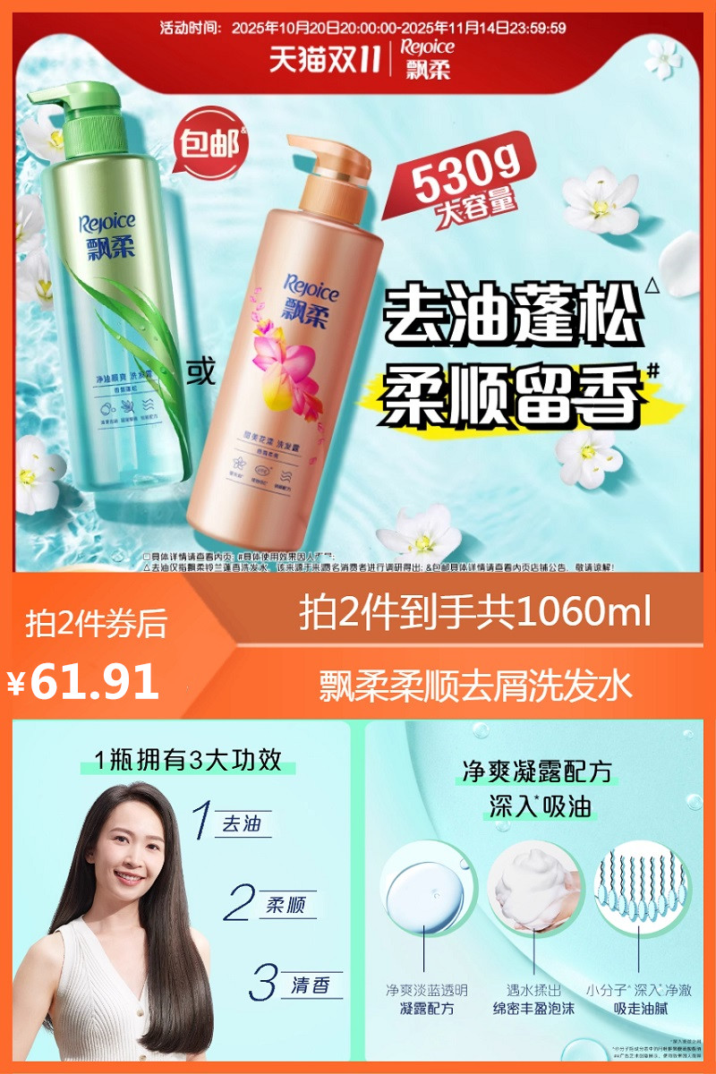 【叠消费券到手更省】飘柔净油顺爽系列全新升级!微米级精华胶囊,净爽凝露配方,深层清洁去油清爽,添加植物精粹,轻盈柔顺,多款可选,48小时持久留香,做高颅顶甜美女孩~