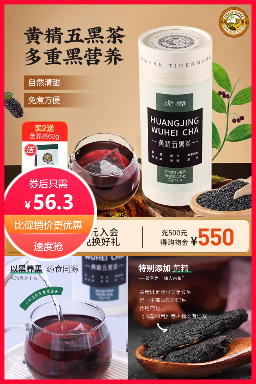 【VIP专享再立减7.9元+淘金币】虎标桑葚黑豆黑枸杞黑芝麻黑米五黑袋泡茶,一杯喝到多重黑营养,以黑养黑,药食同源,元气满满,轻松呵护!