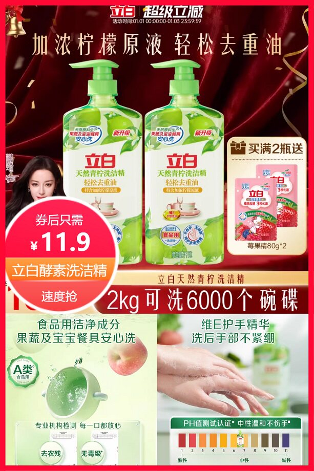 拍1kg*2瓶选项送莓果洗洁精80g*2袋,超级立减1.7元+88vip省0.6元+淘金币抵扣0.27元后21.45元,单瓶只需10.7元,买4瓶送apg白桃220g*1瓶,立白天然青柠洗洁精,加浓柠檬原液,有效瓦解重油,食品级,果蔬,宝宝餐具安心洗,PH值中性温和不伤手!