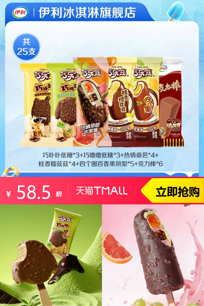 伊利 【热销】伊利冰淇淋巧乐兹新口味共25支 100元减41.5 商品纠错