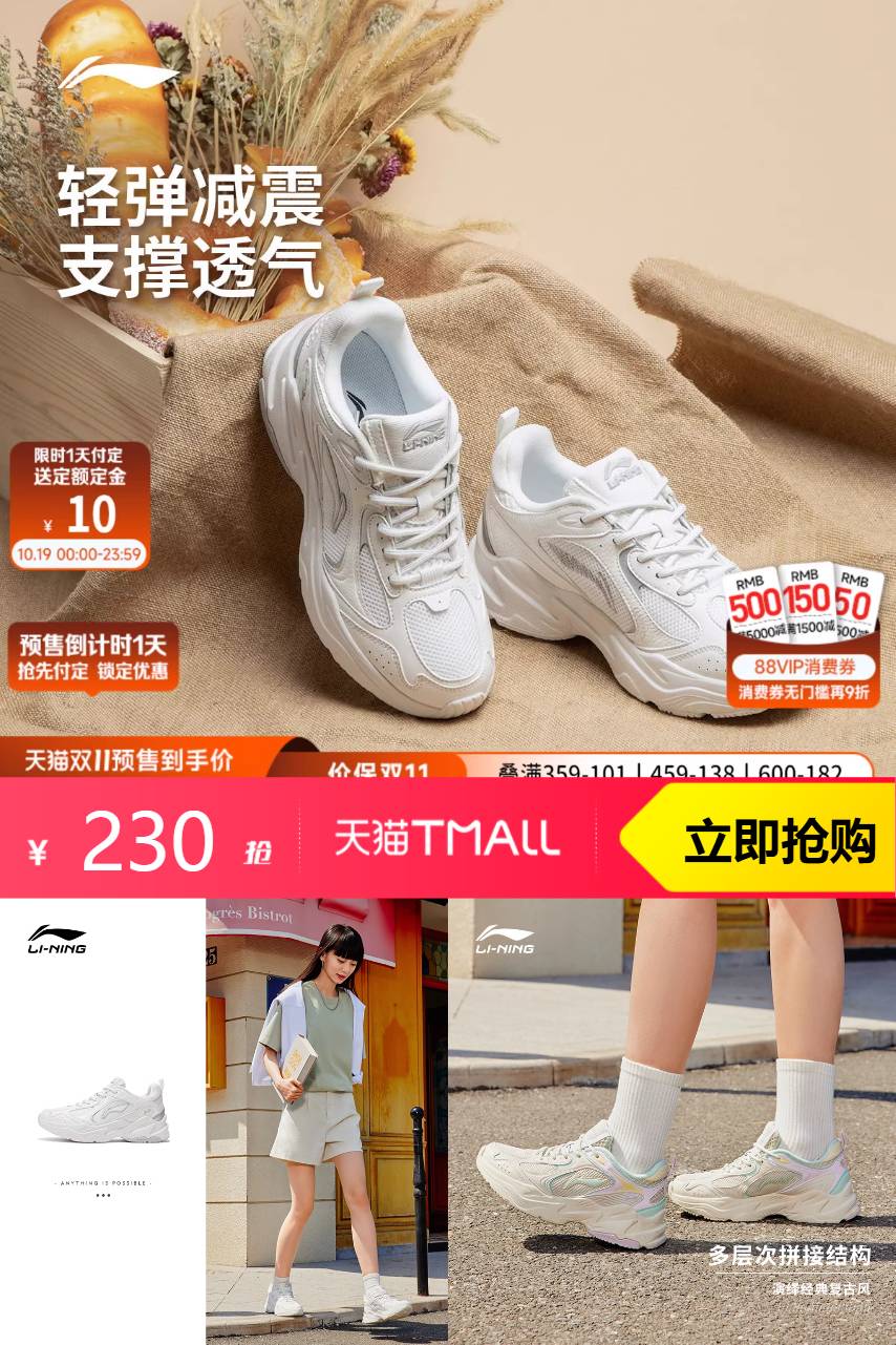 【可叠李宁大额券1000-170,运动户外品类券,消费9折券,9.4折购物金后到手135左右;】李宁跑步鞋男女款休闲鞋,老爹鞋风格鞋型,融合略带增高中底,修饰腿型,日常出街,轻松凹造型辅以多材质拼接网革面设计,配以牢固缝制线,柔韧舒适,保持足部畅爽~
