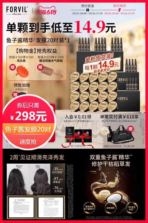 官方立减48元+立减42元+券10元+店铺限时9.3折省20元+点击右上角进入淘金币省7.96元+消费券25元后约245.04元,入会0.01元送洗发露8ml*2+护发精油1ml*1,鱼子酱精华发膜20对装,精致懒人,高效省时发膜,5秒速洗修复,光泽度+76,涂抹后即刻渗透,无需等待!