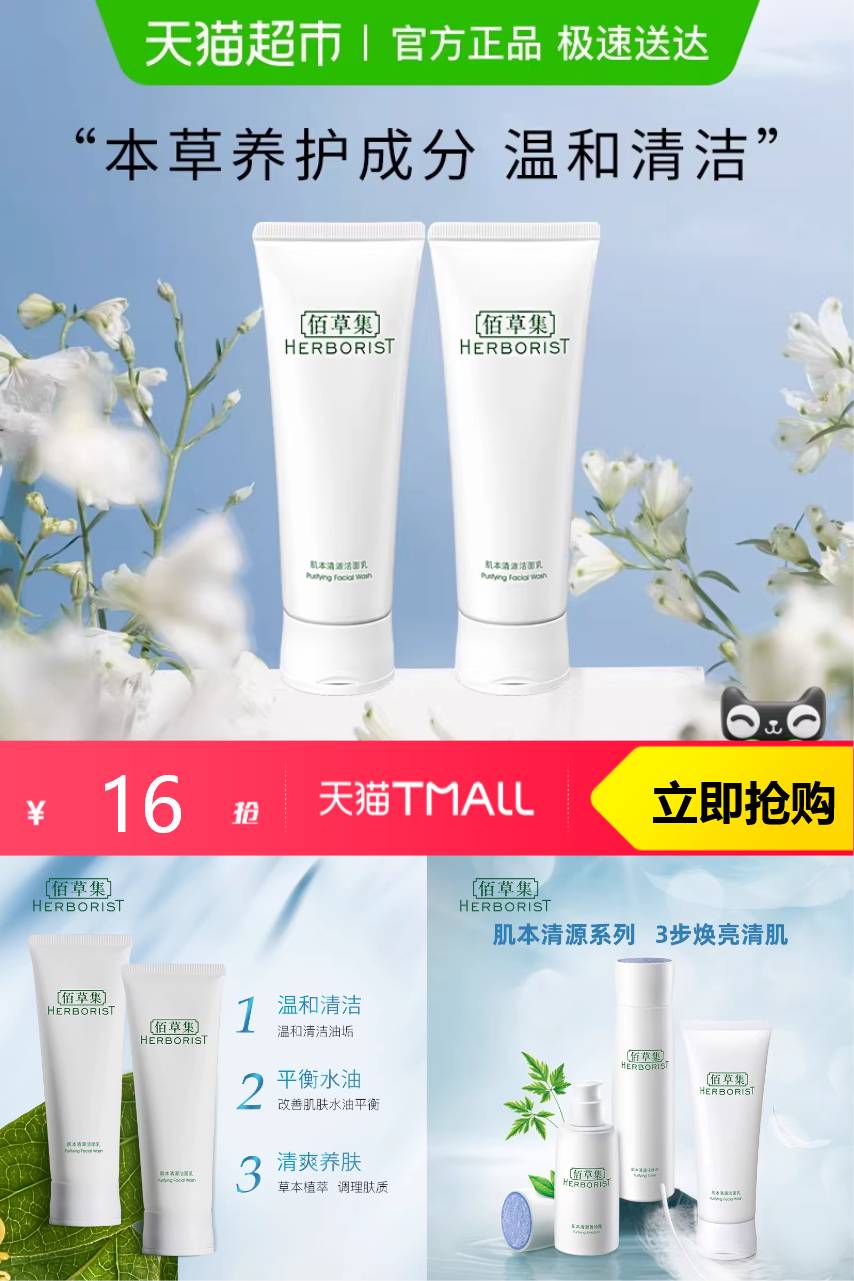 【淘金币抵扣1元+超市补贴0.2+88vip抵扣0.79+消费券立减1.69到手12.32 2支 6块钱一支】Herborist/佰草集肌本清源洗面奶120ml*2支,清洁保湿温和舒缓,让肌肤水润不干燥。