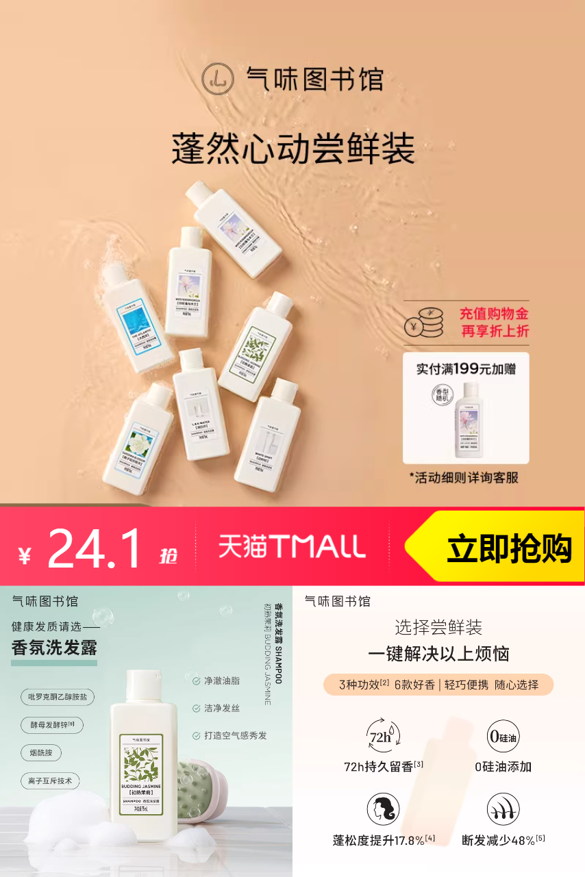 【拍3件到手24.1!叠加1.6淘金币到手22.5,凑消费劵到手19.8,多种香型任选,洗发水、沐浴露、身体乳!】,气味图书馆香氛洗发露便携装出差旅游小规格瓶装洗发水护发素75ml