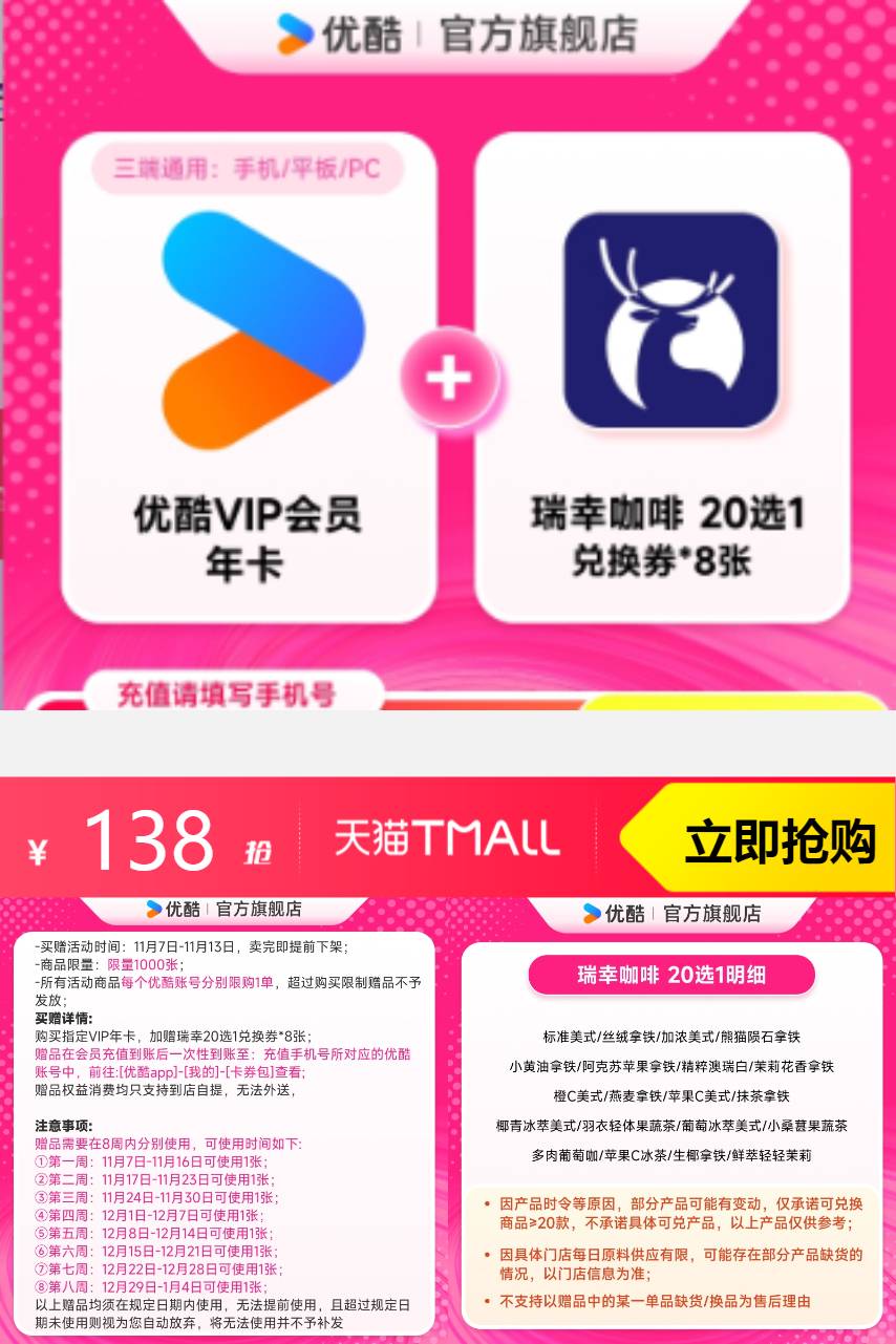 【优酷vip年卡+8张瑞幸咖啡券(20选1),账号直冲限量】嗨购不停歇,双重福利来袭! 优酷会员年卡,你值得拥有!
