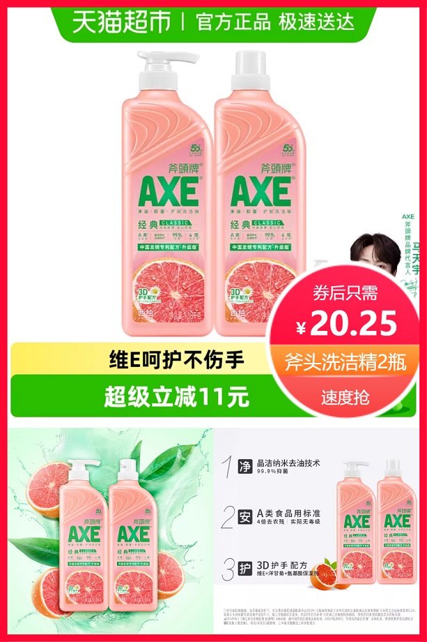 超市立减11元+券6元+88vip省1.15元+点击右上角三个点进入淘金币抵扣2.65元后约19.1元,满2件9折更实惠,AXE/斧头牌洗洁精西柚1.18kg*2瓶维E+洋甘菊护肤不伤手可洗果蔬,可洗果蔬维E护肤,多效除菌!