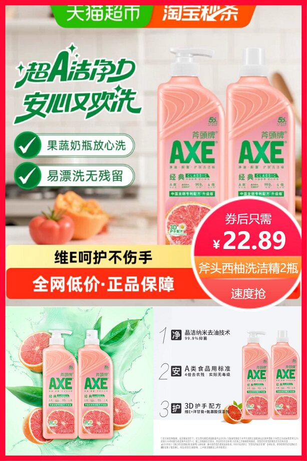 淘礼金省1.32元+直降立减9.43元+券4元+88vip省1.32元+点击右上角三个点进入淘金币抵扣3.58元后约20.25元,叠加猫超搜索斧头5元购物金5元后15.25元,叠加消费券后13.3元!AXE/斧头牌洗洁精西柚1.18kg*2瓶维E+洋甘菊护肤不伤手可洗果蔬,可洗果蔬维E护肤,多效除菌!