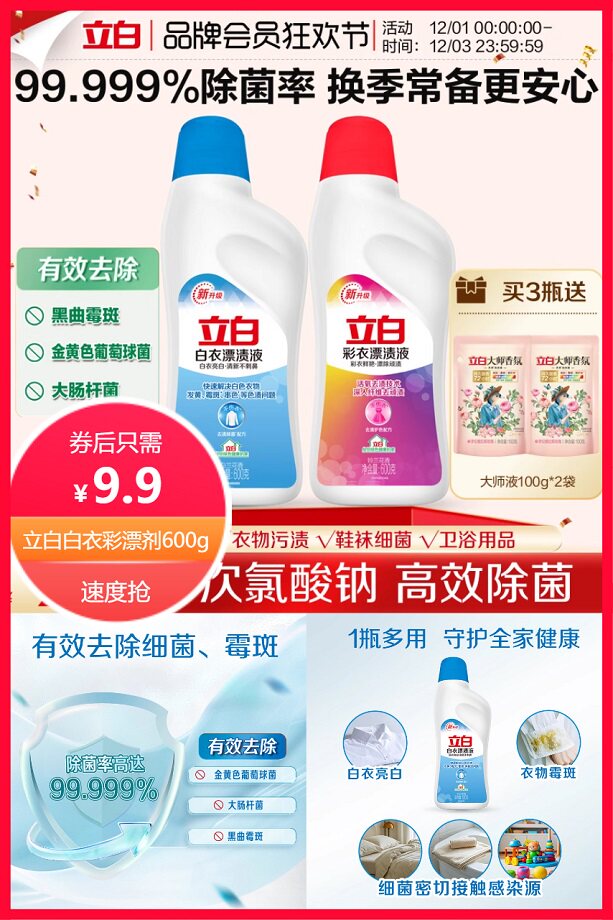 官方立减1.4元+下拉详情淘金币抵扣0.22元+88vip省0.5元后约9.18元更实惠,立白白衣彩衣漂渍液600g*1瓶,含次氯酸成分,安心防疫,除顽渍除菌洁净,彩衣鲜艳,气味清新,快抢购吧!!