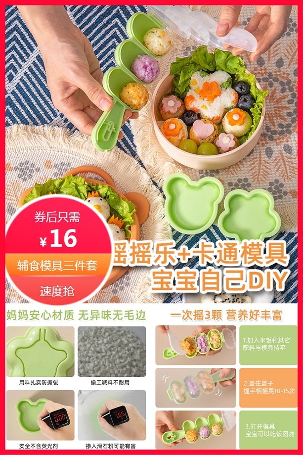 超级立减1.9元后约16元,易优家,辅食工具套装:饭团摇摇乐+卡通辅食模具+多功能料理勺,宝宝漏勺,辅食工具,食品级沥水勺,辅食泥研磨捞勺,一勺多用,为宝宝呈现更多美食,耐高温120℃,凸点小颗粒按压,轻松成泥,营养好吸收,宝宝吃饭香!