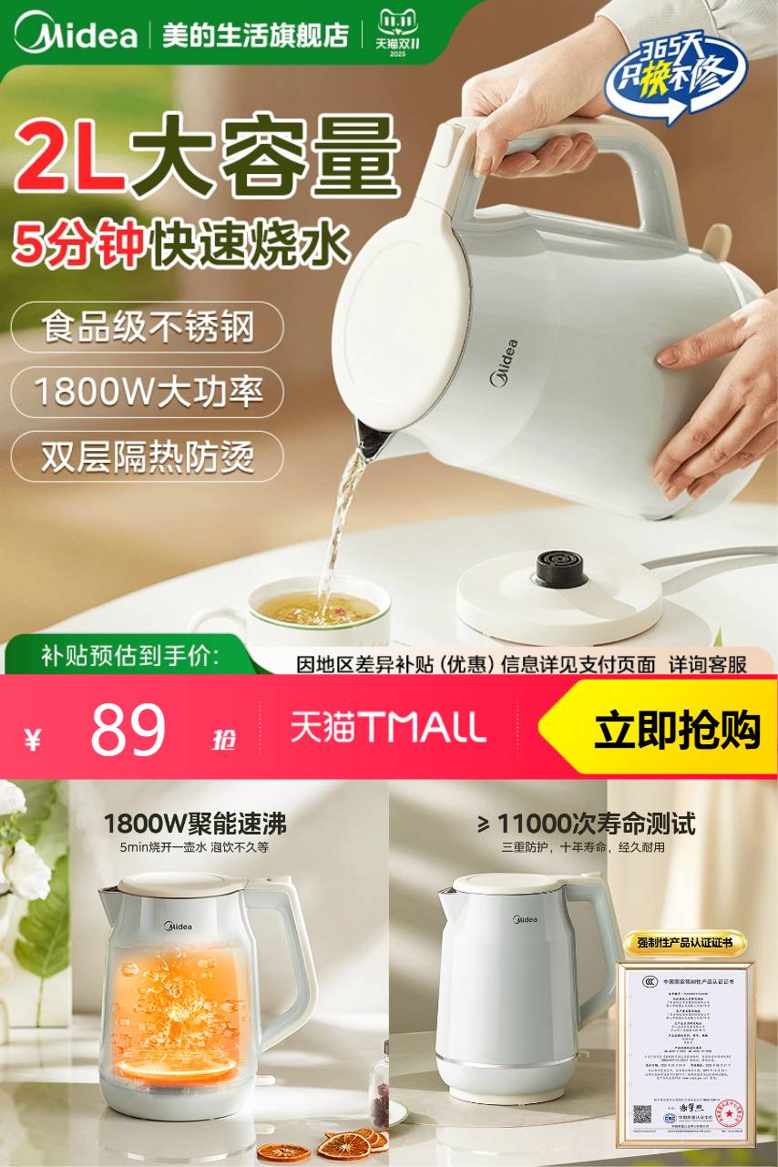 ⭕美的电热水壶浅绿色 2L 小绿墩