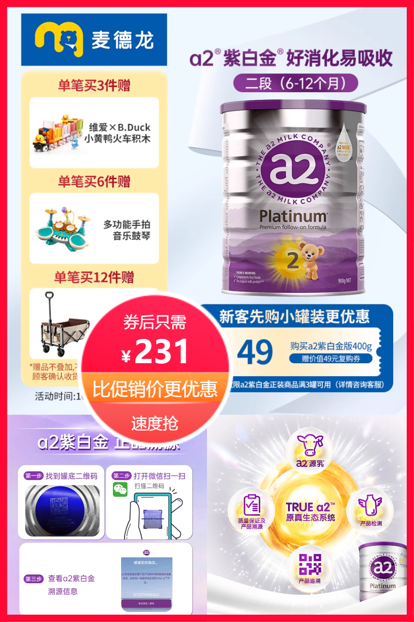 麦德龙A2紫白金奶粉,专享新西兰产,护肠力MAX,营养全面升级!满载:A2蛋白,助长智脑力。一键解锁官方热线,解答疑问!适合6-12月宝贝喝~