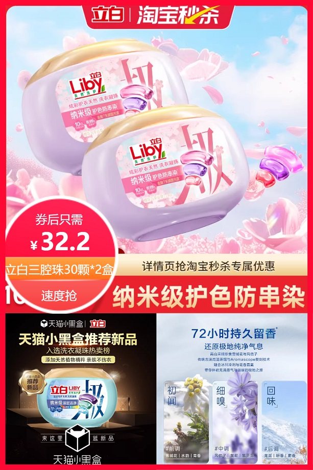 下拉详情淘金币抵扣2.7元+88vip省1.75元后约30.45元,单盒只需15.2元,限时秒杀,立白高端三腔珠,极地护衣洗衣凝珠,速溶护衣护色三合一天然留香珠,10倍洁净护色防串色,持久留香21天!