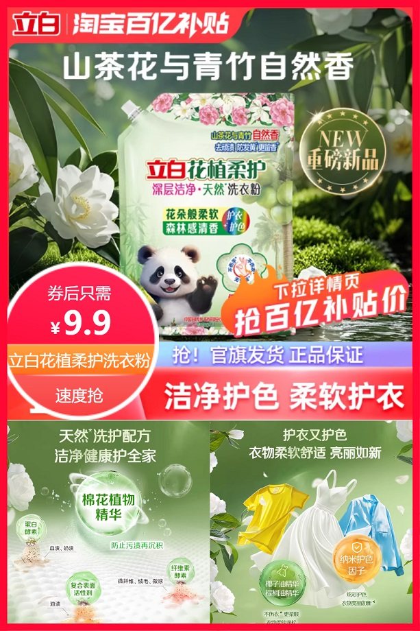 下拉详情百补9.9元,立白花植柔护洗衣粉850g,7种花植鲜活成分,深层洁净,护色护衣,比国标洗衣粉更留香。留香更持久!
