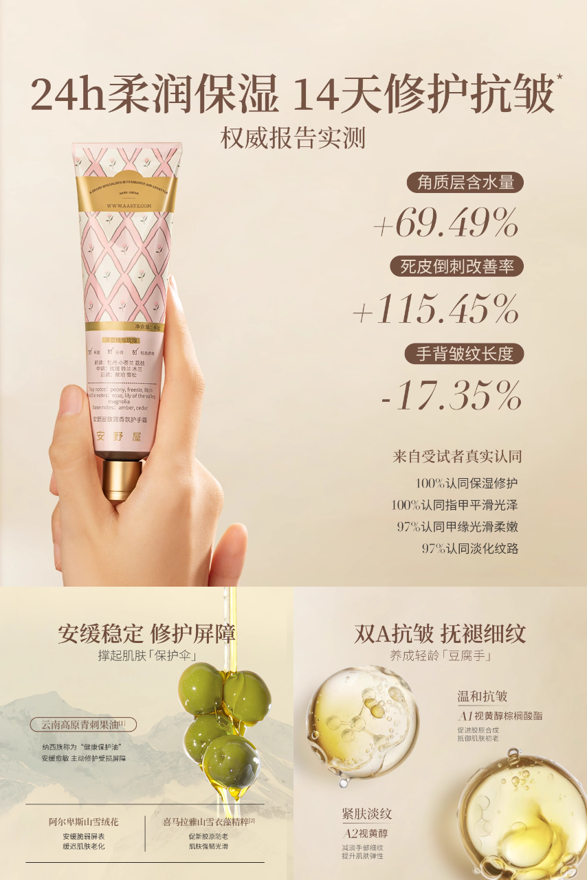 【买就送试用装】aarye安野屋馥润抗皱修护香氛护手霜,双A紧肤抗皱,抵御手部初老,多重精油保湿,手甲共同养护,强韧肌肤屏障,24h柔润保湿,14天修护抗皱,抚褪细纹,养成轻龄豆腐手!