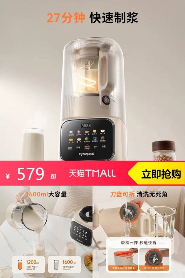 【有;凑淘金币+消费券+国补到手387,ST送30元】九阳破壁机可拆洗家用全自动豆浆机,可拆清洗更彻底,轻音低噪更细腻~