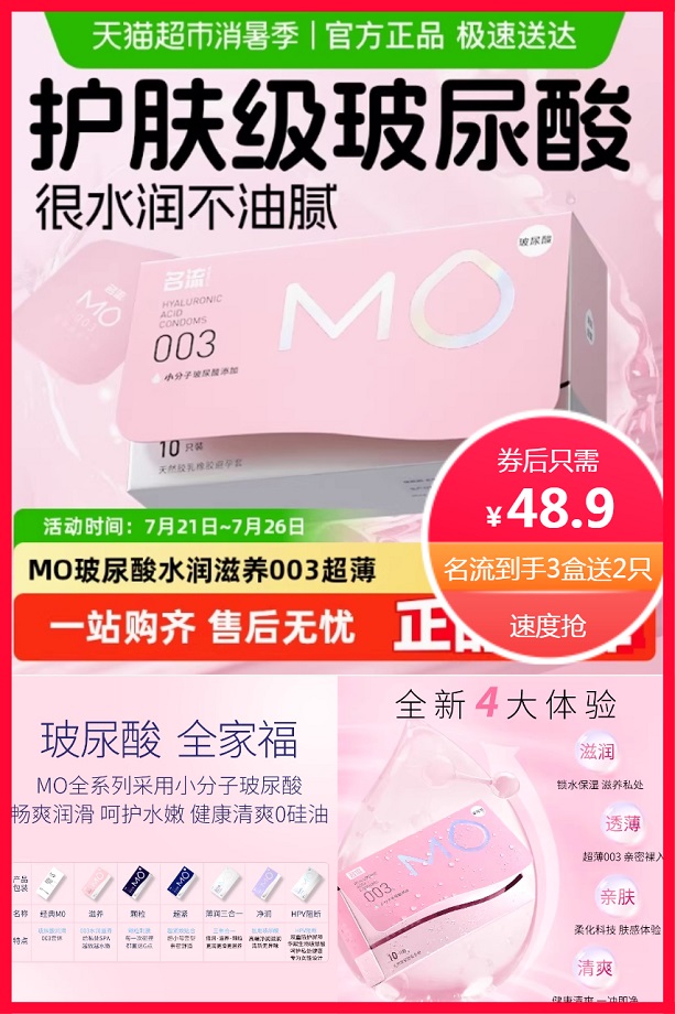 猫卡4元+超市立减12元+券3元后约44.9元,88vip+9折消费券更实惠,限时个sku玻尿酸臻享【30只】享受买就送MO同款2只*1盒,总计到手4盒,猫超包邮半日达,名流MO玻尿酸避孕套安全套,粉色滋养情趣超薄润滑,003男用女用。
