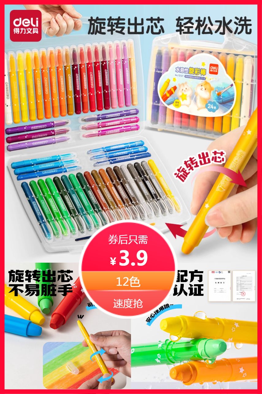 " 叠金币3.56元~得力经典油画棒,安全无毒可水洗!笔尖画线条,笔尾大面积涂色,让孩子享受绘画乐趣~激发培养创造力!满足孩子的绘画需求!抗菌无毒不脏手~