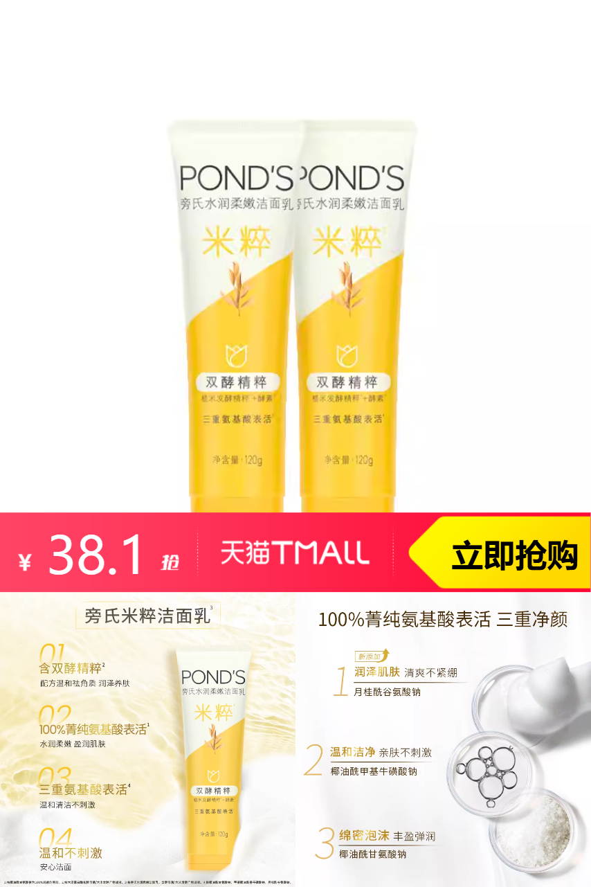 【叠加淘金币0.98元+凑单消费券200-25=到手仅需32.48元。合计单支/16.24元,随机弹限时红包到手更低】旁氏米粹洗面奶120g*2支,平价国货!口碑爆款!含双酵精粹,百分百菁纯氨基酸表活三重净颜,润泽肌肤,泡沫绵密,温和不刺激,安心洁面,洁肤焕颜,清爽一夏~