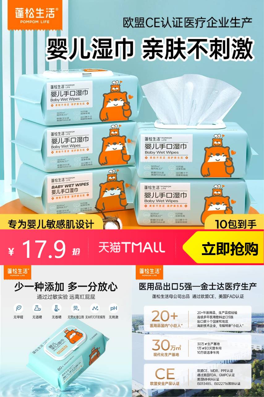 【淘金币抵扣0.57,到手17.33】蓬松生活婴儿湿纸巾80抽大包装,宝宝专用,亲肤无敏,强韧不掉絮,一巾多用,呵护宝宝娇嫩肌肤,囤货必备!