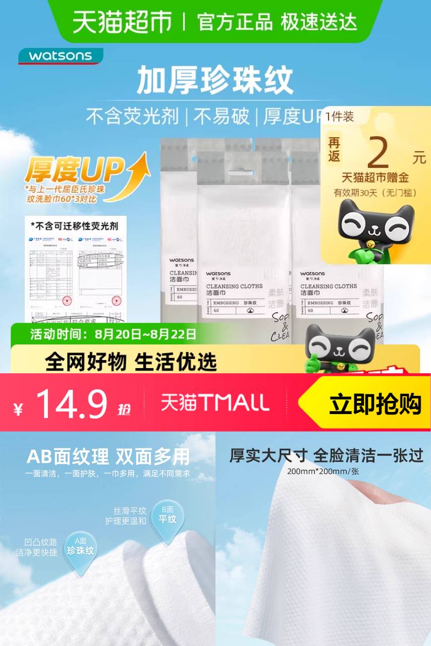 【可叠加淘金币0.4,88到手13.75,返3猫卡,折2.6一包】这款棉柔巾,采用优质纯棉材质,柔软细腻,触感舒适。它不仅具有超强的吸水性,还能轻松去除肌肤上的污渍和多余油脂~