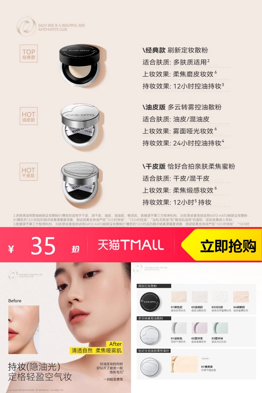 【官方立减15元+24元券+美妆惊喜券10.36元+0.74元淘金币+9折消费券到手21.51元,3.0散粉买2件赠散粉刷*1+卸妆湿巾*2+黑粉扑*2】KATO定妆散粉控油持妆粉饼柔焦,持久定妆,告别脱妆尴尬,控油抗汗,一整天轻松自在~