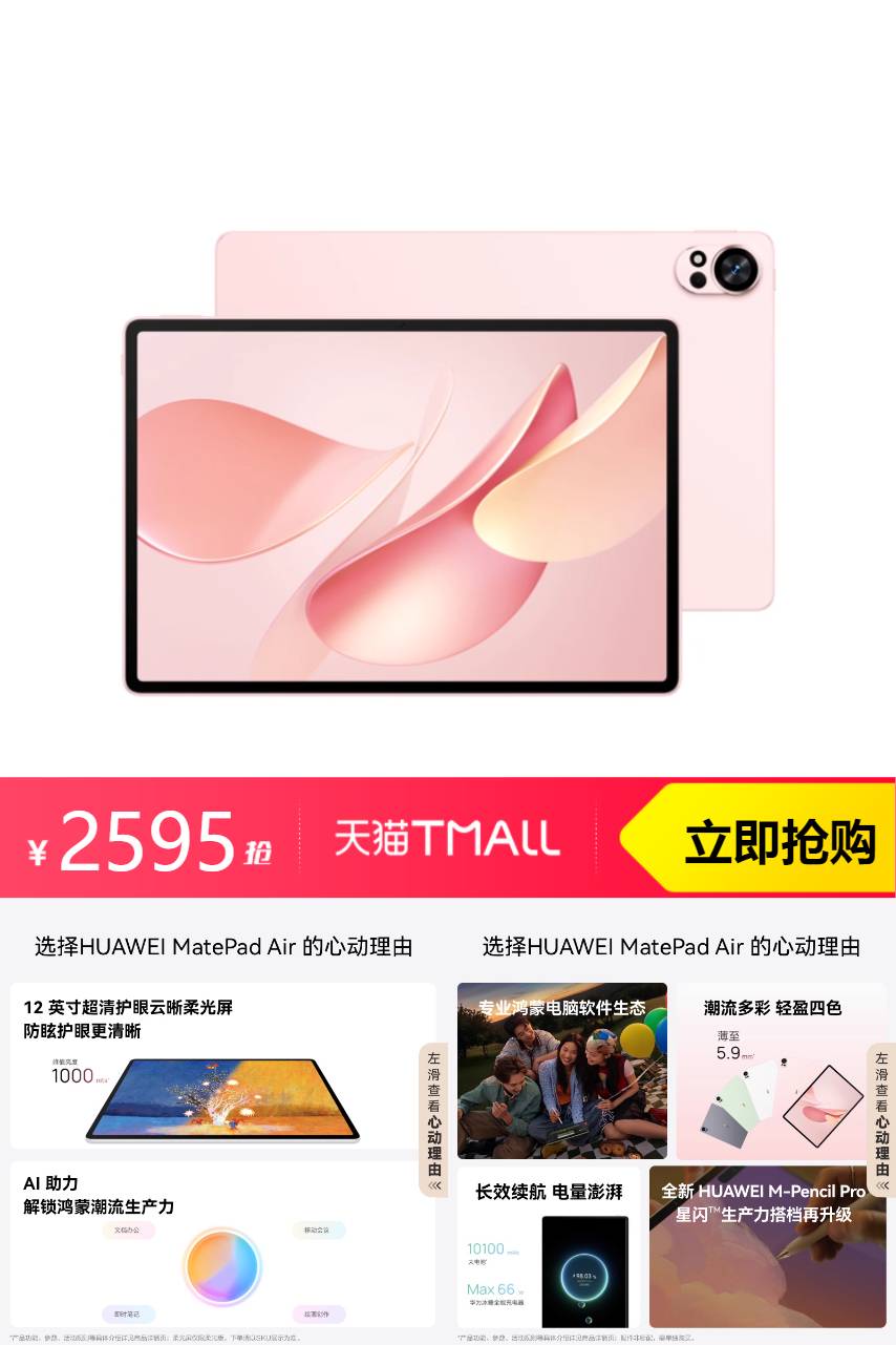 【原价2799-立减94-限时限量补贴110-淘金币151.48-教育优惠150-国补15%=1949,淘金币可达1879!6期免息,S单赢耳机,国补多地可用速冲】【国补】华为MatePad Air 12 英寸,超赞~