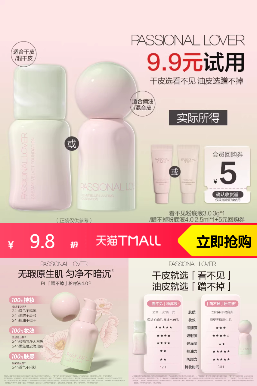 【百亿+消费券和精致生活券到手8.2】PL看不见3.0蹭不掉4.0粉底液,干皮就选「看不见」,油皮就选「蹭不掉」,粉感消失不见,水光自然透现,12H抵抗暗沉。自然色系,完美贴合你的肤色,打造自然无瑕的妆感,不易卡粉、细腻易推,这就是PL带给你的美妙体验!快来试试吧!
