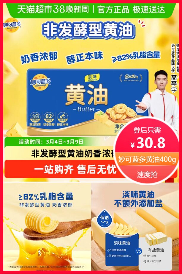 超级立减16.2元+券3元+88vip省1.54元后约29.26元,非发酵型黄油,奶香浓郁,淡味黄油,不额外添加盐,精选优质牧场,优质奶源,从源头把控!