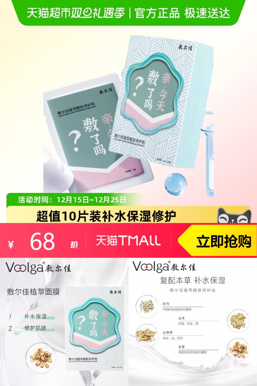 【淘金币抵扣1.04元,叠加88vip抵扣3.4,消费券后到手55.7】补水保湿修护肌肤,敷尔佳植萃醒肤修护贴~