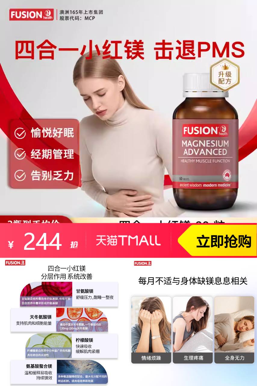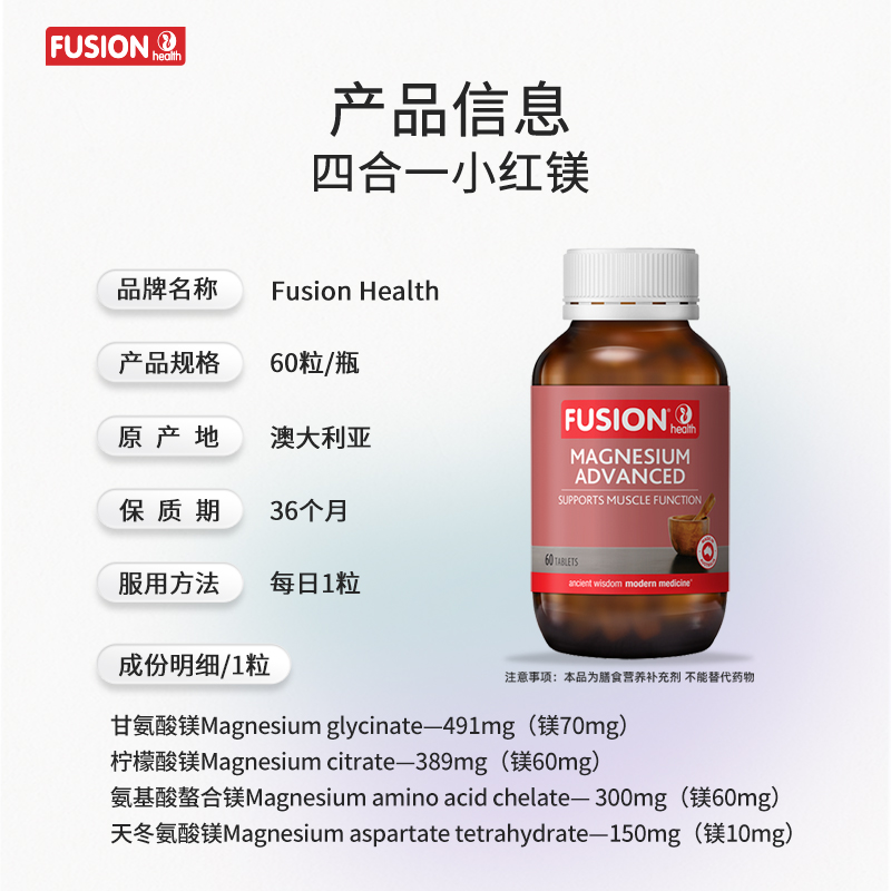 【原价289,官方立减44,领券立减1,叠加九折消费券到手仅需219.6】FusionHealth澳辉生高级镁甘氨酸镁女性成人缓解,超赞!
