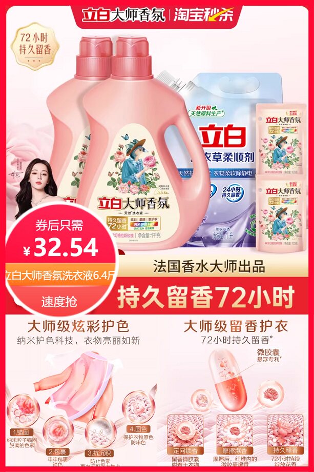 券13元+超级立减18.36元+淘金币抵扣4.36元后约32.54元6.4斤,立白大师香氛洗衣液4.4斤+薰衣草柔顺剂2斤共6.4斤,迪丽热巴推荐高端洗衣液,72小时持久留香,深层瓦解污渍,洗的干净不伤手,持久留香,推荐!