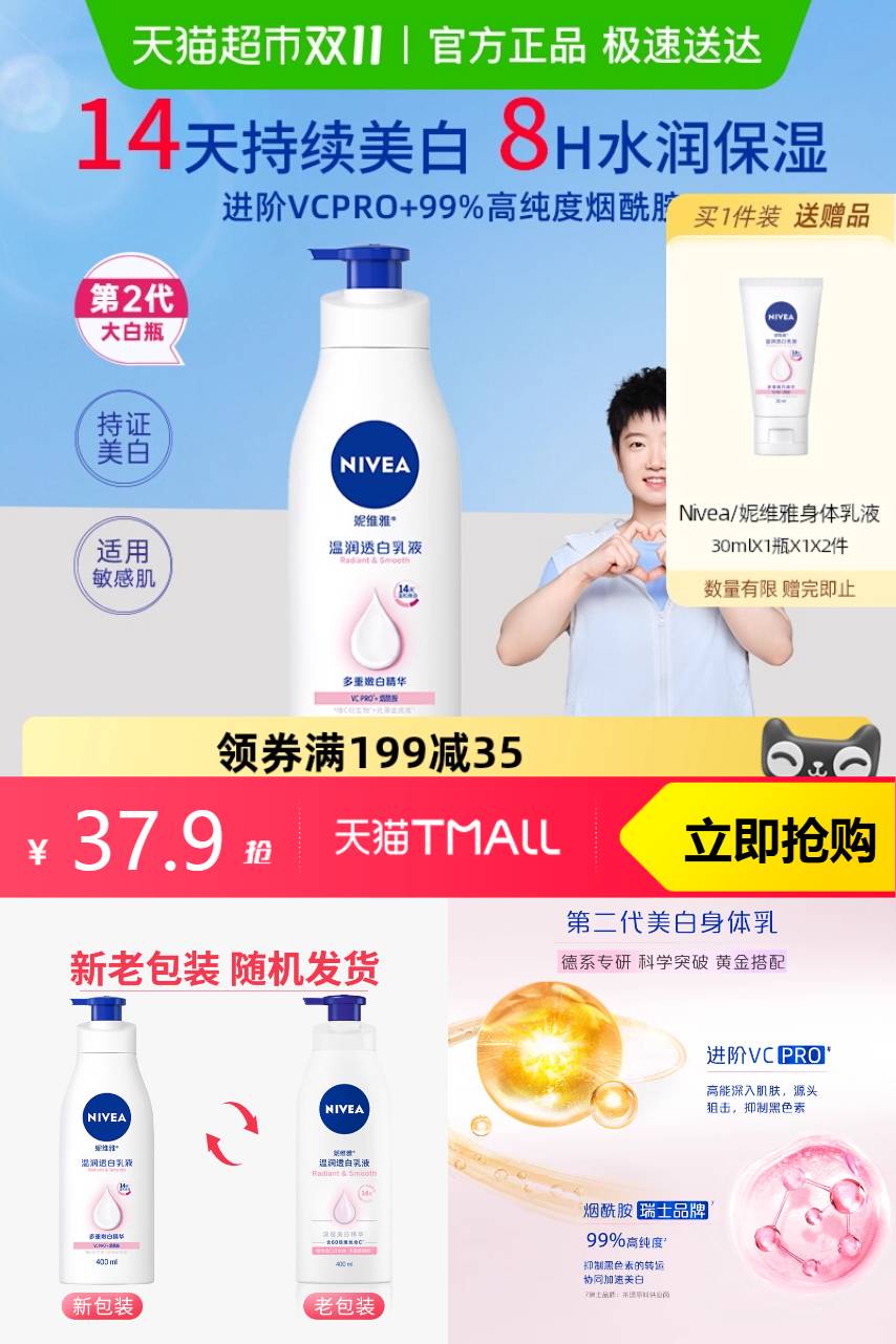 【立减19元,券3元,淘金币1元,新客2元,88vip到手20元;赠30ml小样*2】妮维雅第二代「大白瓶」身体乳,进阶VC Pro'14天*持续美白~