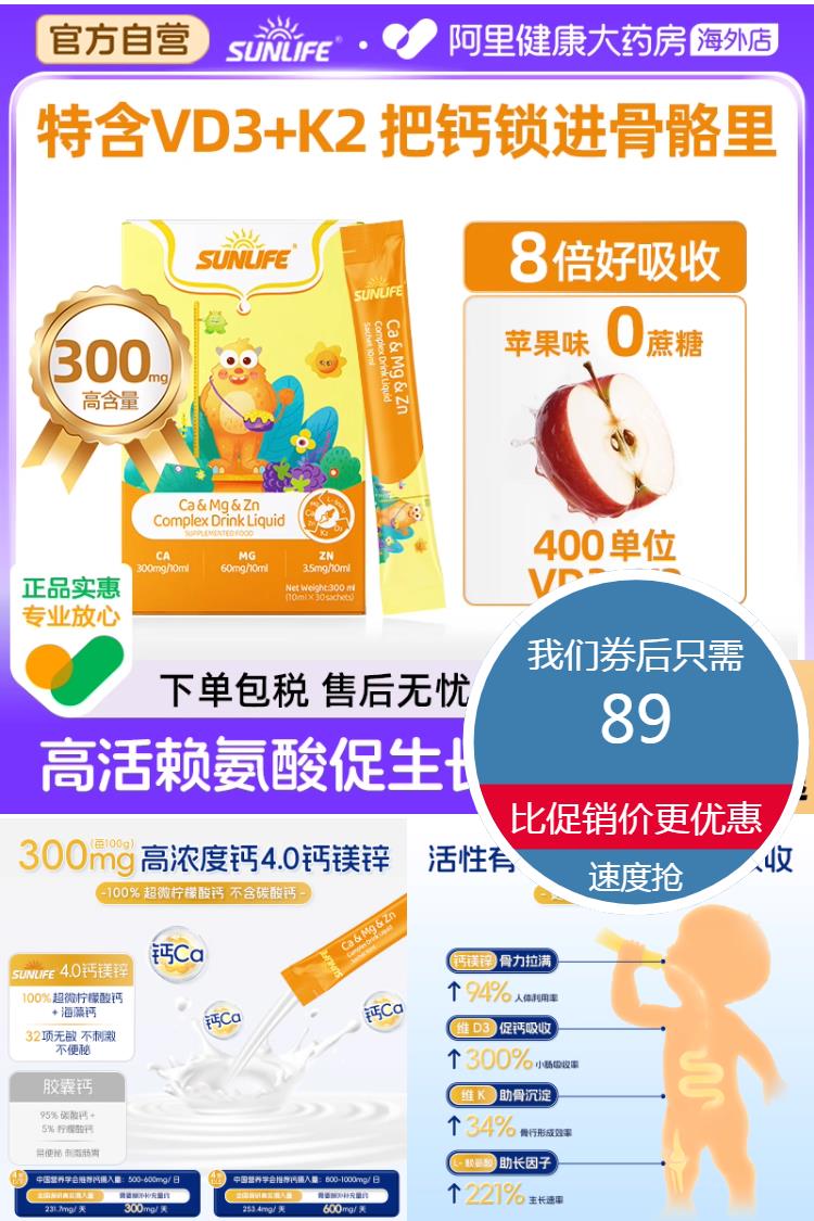 【叠加首单礼金到手仅需74元,闭眼冲,随时关券】宝妈看过来!生命阳光液体钙镁锌,一瓶补全成长关键营养!海藻钙+VD3+K2,促进吸收不浪费。赖氨酸打开胃口,宝宝吃饭香香~液态更适合婴幼儿娇嫩肠胃,长高长壮就选它!