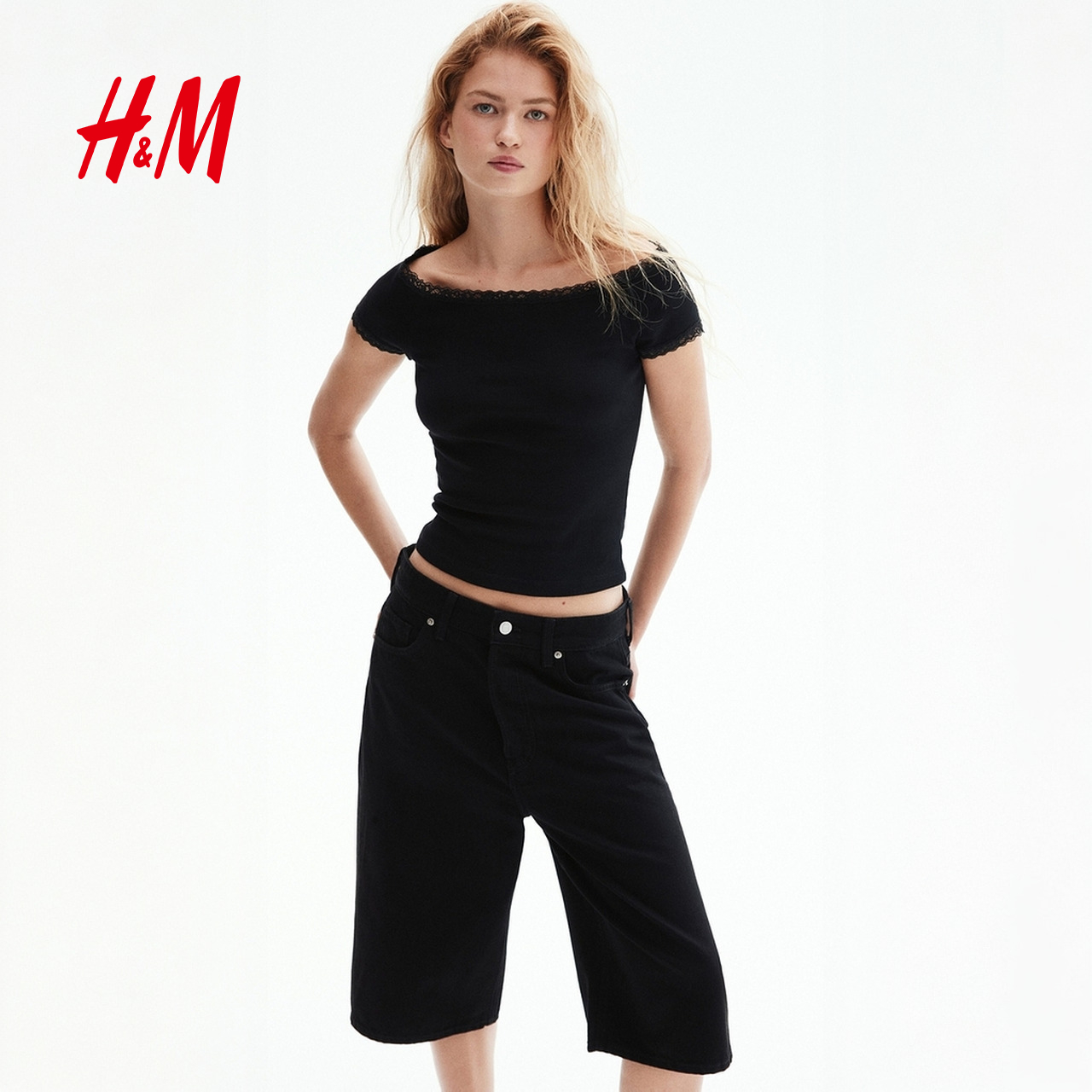 HM女装T恤2025秋季新款一字领露肩修身短袖蕾丝边短上衣1292707