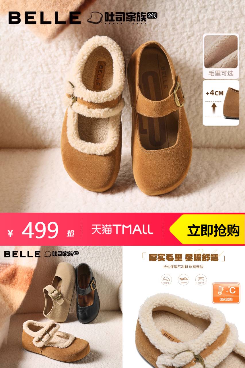 【领60券+淘金币抵15+消费券到手373】周雨彤同款百丽半糖吐司加绒厚底勃肯棉鞋,厚实毛里柔暖舒适,软糯亲肤保暖不显臃肿,踩压后快回弹,久穿不易变形~