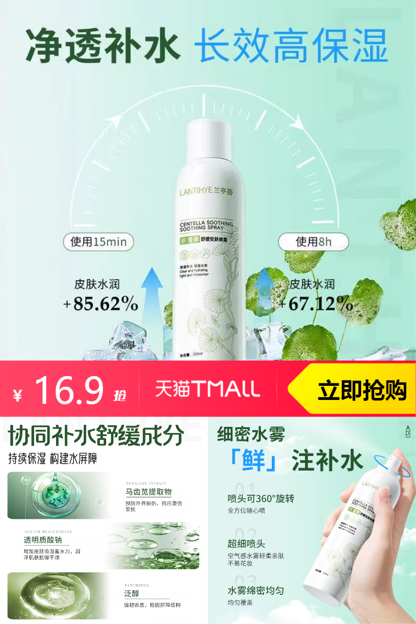 【1、淘金币2.49,88VIP0.85,新客立减2元,到手价11.56】兰亭荟积雪草舒缓安肤喷雾200ml*2瓶,净透补水,长效高保湿。