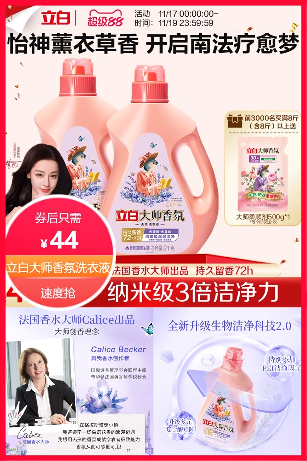 官方立减9.6元+券10元+88vip省2.2元+淘金币1.27元+首单3元后约37.53元,店铺限时浏览红包更实惠!法国香水大师Calice出品!留香72小时,纳米护色科技,炫彩护色,衣服亮丽如新,天然酵素,深层洁净,柔软养护,护衣更护手~