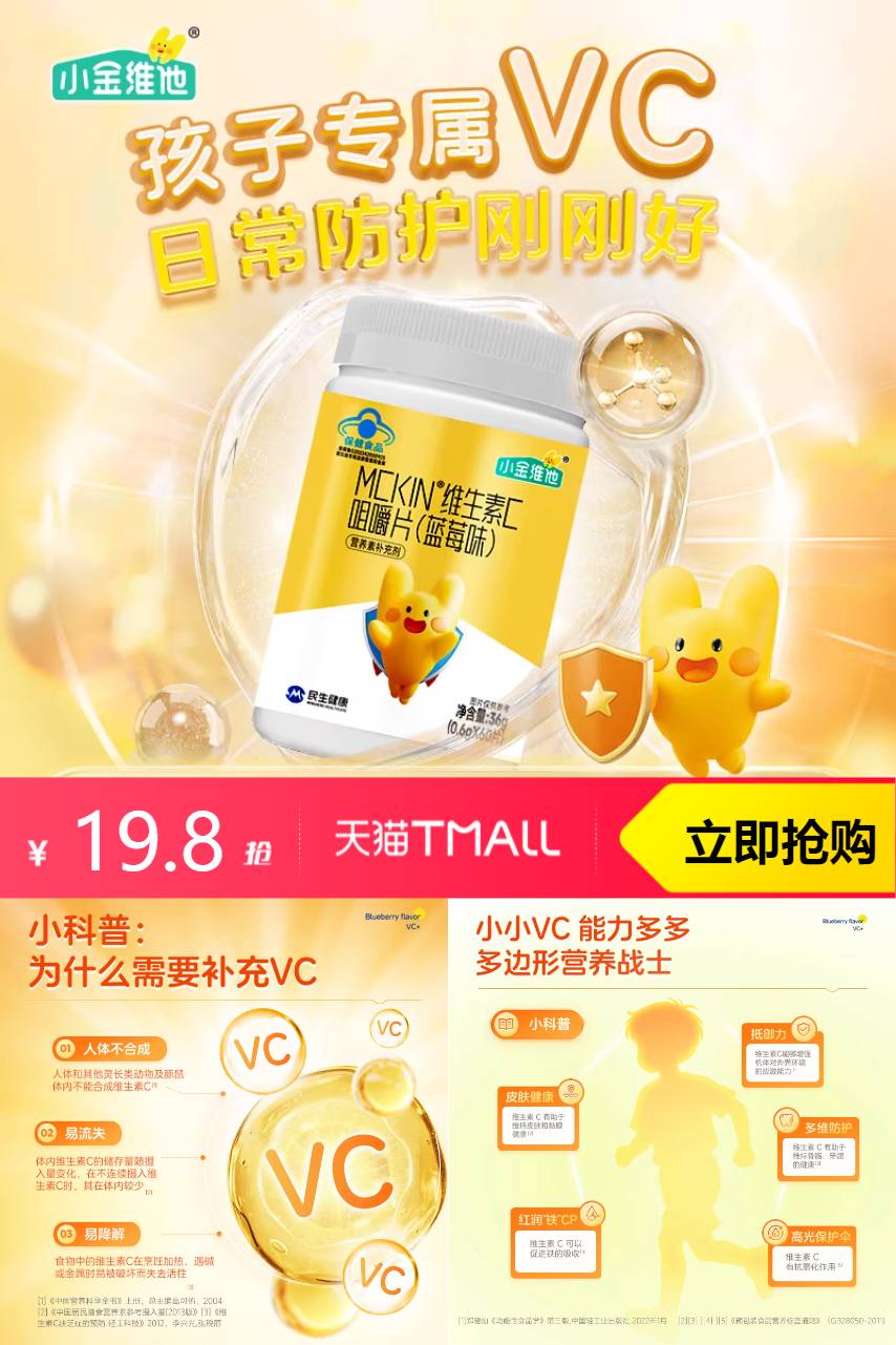 【yjpz后60%,叠加淘金币0.6元到手19.2元】21金维他儿童维生素C60粒*2,采用咀嚼式设计,让宝贝轻松补充每日所需。