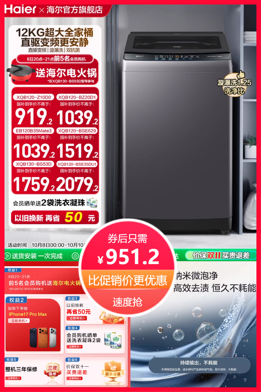 【下拉详情页领取国补资格,享8.5折优惠最;淘金币至高可额外抵扣60元。惊喜立减50元,近期好价~】洗衣机以旧换新补贴,海尔波轮全自动家用12kg,超大容量除菌20D1,超赞~
