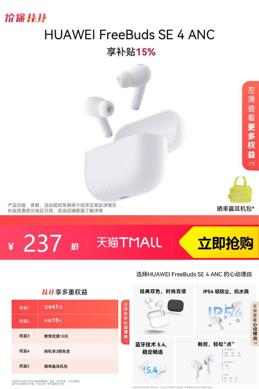 推荐:华为FreeBuds SE4ANC降噪版