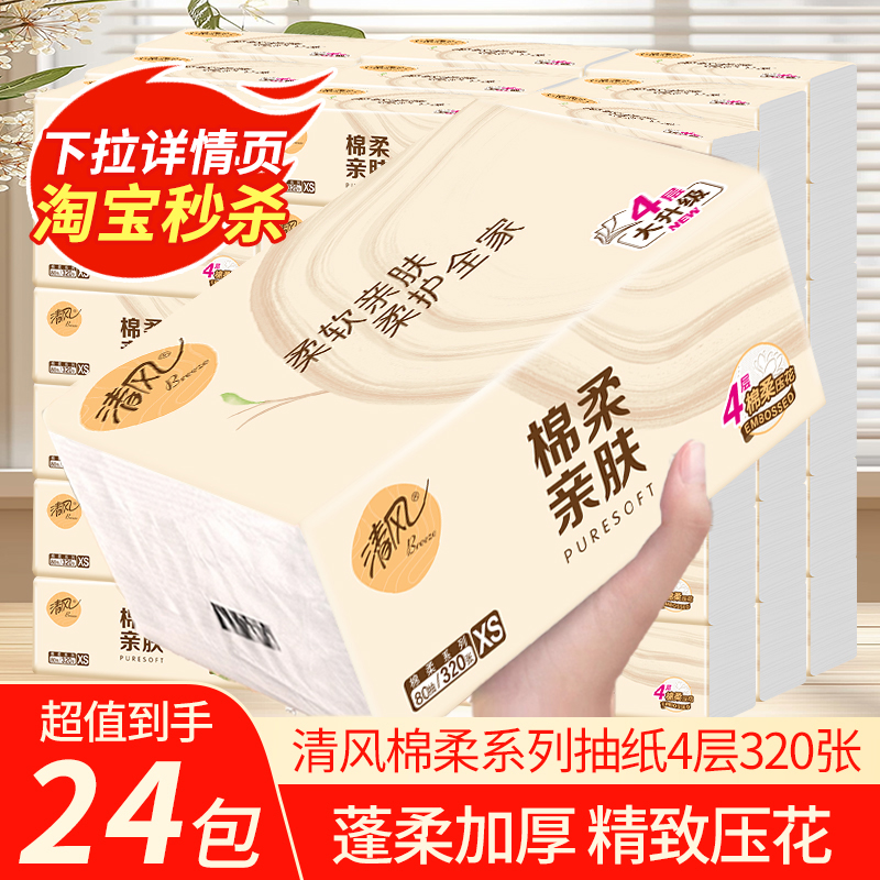 清风纸巾抽纸24包整箱家用实惠装棉柔系列餐巾纸卫生纸面巾纸大包!