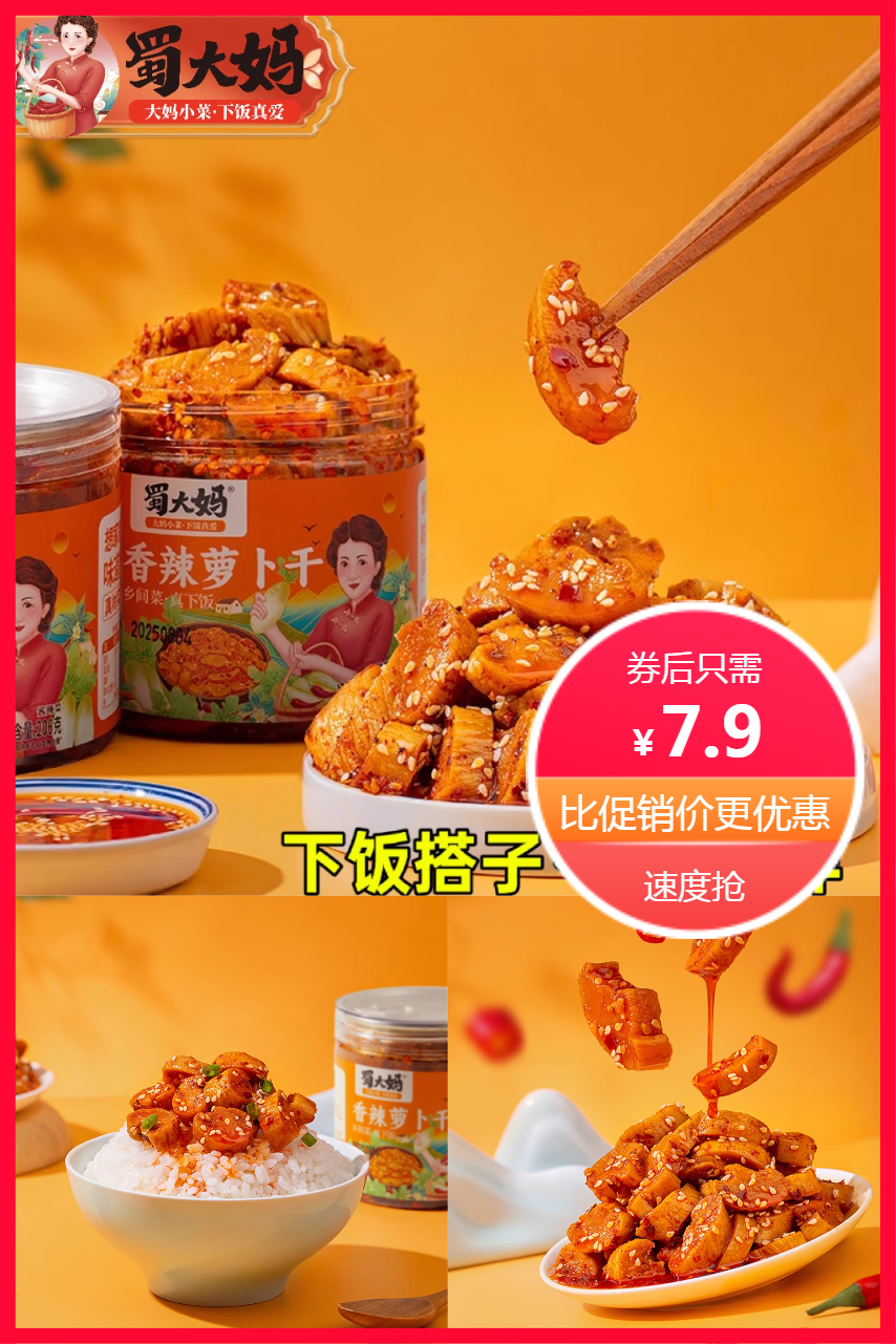 【可签到+首单直降2元+淘金币抵扣到手约2.6元】蜀大妈高山脆香辣萝卜干,品质保证,吃得安心,鲜香麻辣,下饭真爱,开胃首选!厚切大块,自然风干,鲜甜多汁,口感独特,美味无价,吃过都说好,速抢