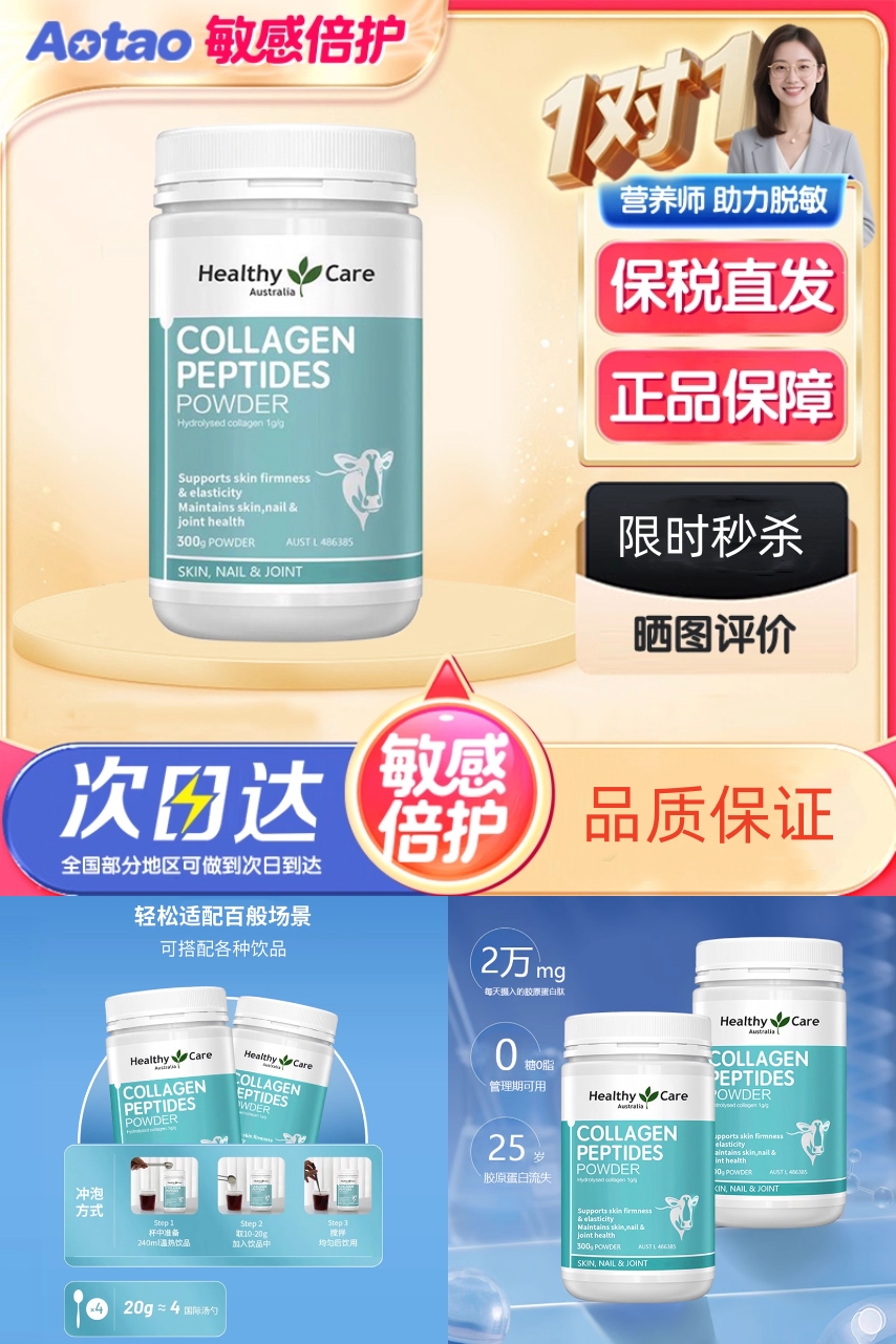 澳洲原装进口HealthyCare胶原蛋白肽粉,美白紧致皮肤易吸收!营养师助力脱敏,报税直发,品质保证,速抢!