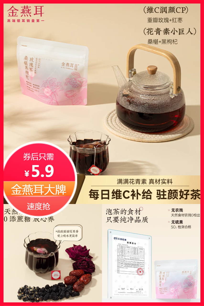 ⭕大牌金燕耳桑葚花青素黑枸杞刺梨玫瑰花茶